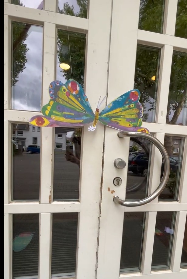 Nach dem Gottesdienst zogen die neuen Schülerinnen und Schüler gemeinsam mit ihren Familien auf den Schulhof ein. Dort bildeten die anderen Kinder der Schule ein Spalier und empfingen sie mit viel Applaus und fröhlichem Winken. Auf dem Schulhof wurde anschließend noch ein Lied gesungen, bevor es für die neuen Erstklässlerinnen und Erstklässler gemeinsam mit ihren Lehrerinnen und Lehrern in die Klassenräume ging. In ihrer ersten richtigen Unterrichtsstunde bastelten die Kinder einen Schmetterling, den sie als Erinnerung mit nach Hause nehmen durften.