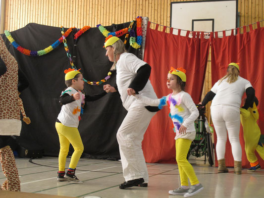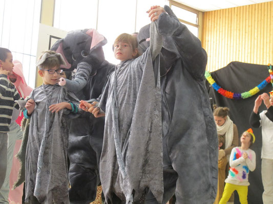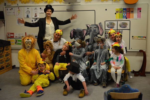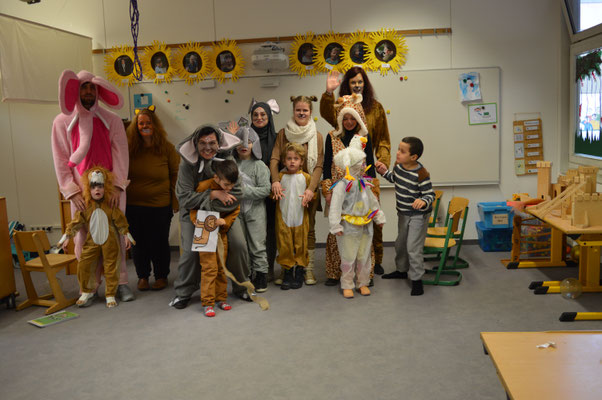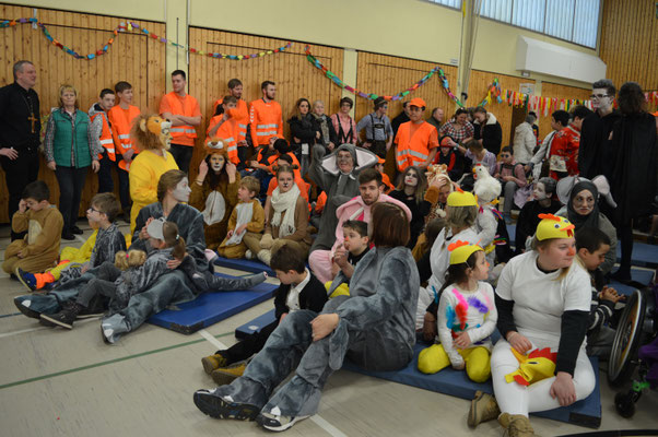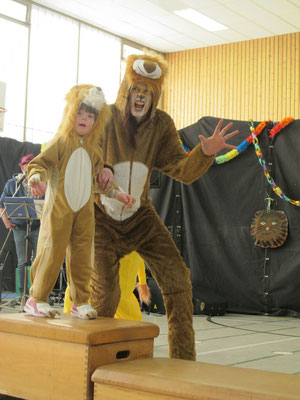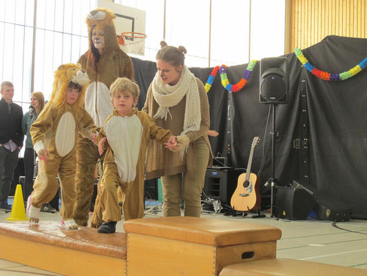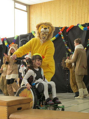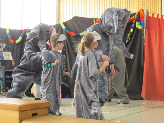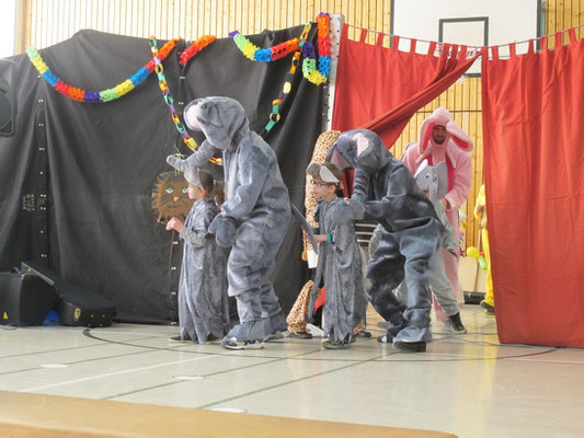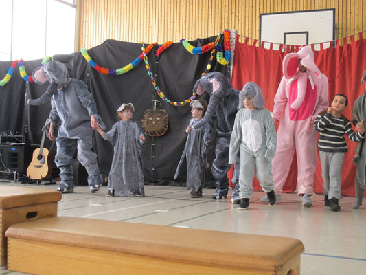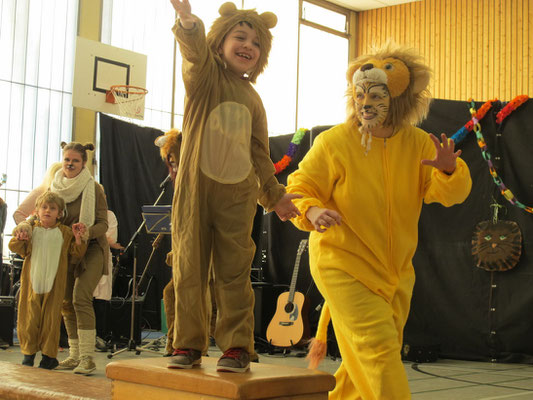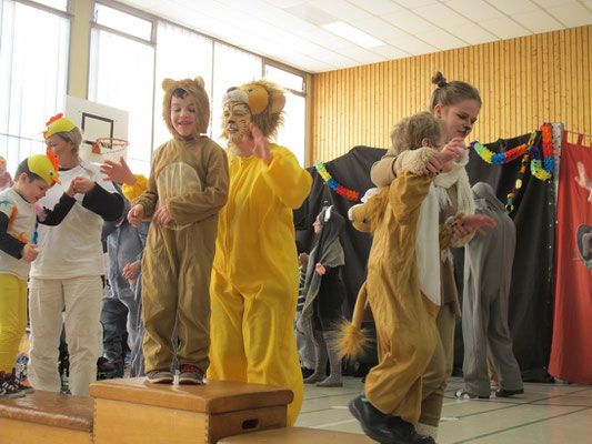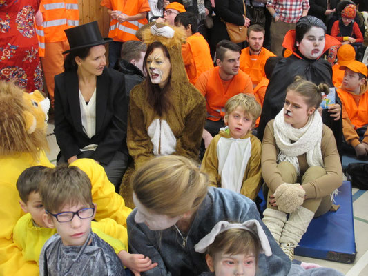 Neu für die Kinder der Vorstufen war sicherlich die Vielfalt der Kostüme und der Auftritt als Löwen und Elefanten vor einer so gro´ßen Menschengruppe.