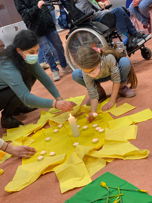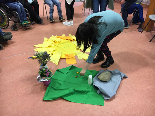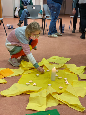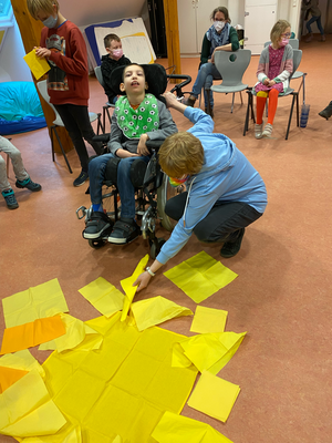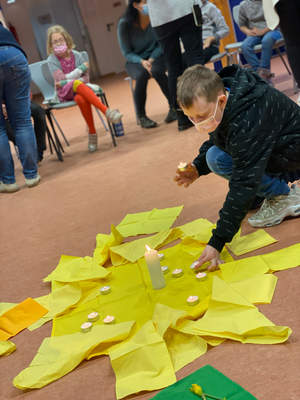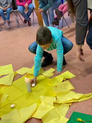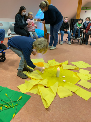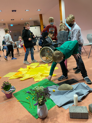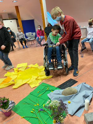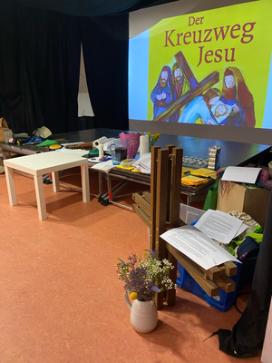 Am 01. April haben wir für unsere Schülerinnen und Schüler mit intensivem Förderbedarf einen Kreuzweg im Söllertheater angeboten. Im Rahmen einer Mehrsinngeschichte hatten die Schülerinnen und Schüler die Möglichkeit, die letzten Tage von Jesus anhand kleiner Mitmachstationen zu erleben. So haben wir zusammen mit den Schülerinnen und Schülern das letzte Abendmahl gefeiert oder uns über seine Auferstehung gefreut und Kerzen entzündet.