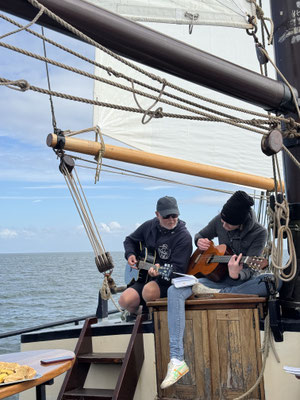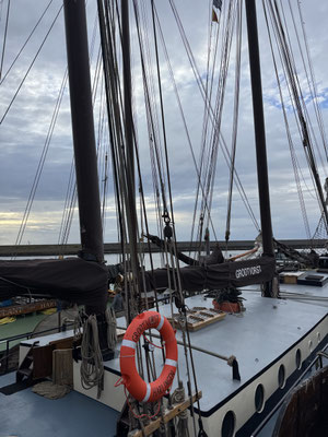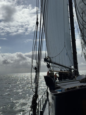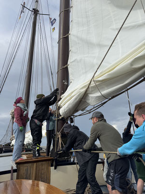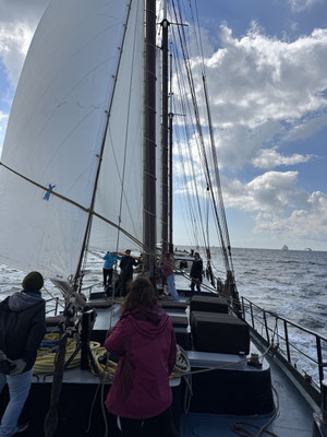 Mithilfe unserer bekannten und beliebten Skipperin Jana und unserem Matrosen Till segelten wir zwei Tage über das Wattenmeer. Von Harlingen aus ging es am Samstagmorgen mit viel Wind und Sonnenschein im rasanten Tempo in Richtung Terschelling. Alle fassten mit an. Sowohl unter als auch an Deck. Jede Hand wurde gebraucht, um uns selbst zu versorgen, die Segel zu hissen, Seile zu knoten oder Wenden zu fahren. Auch im Hafen von Terschelling erwartete uns unerwartet schönes Wetter. Das Örtchen wurde erkundet, eine Runde in der Nordsee gebadet oder einfach an Deck entspannt, bevor der Abend gemeinsam im Restaurant Ausklang fand.